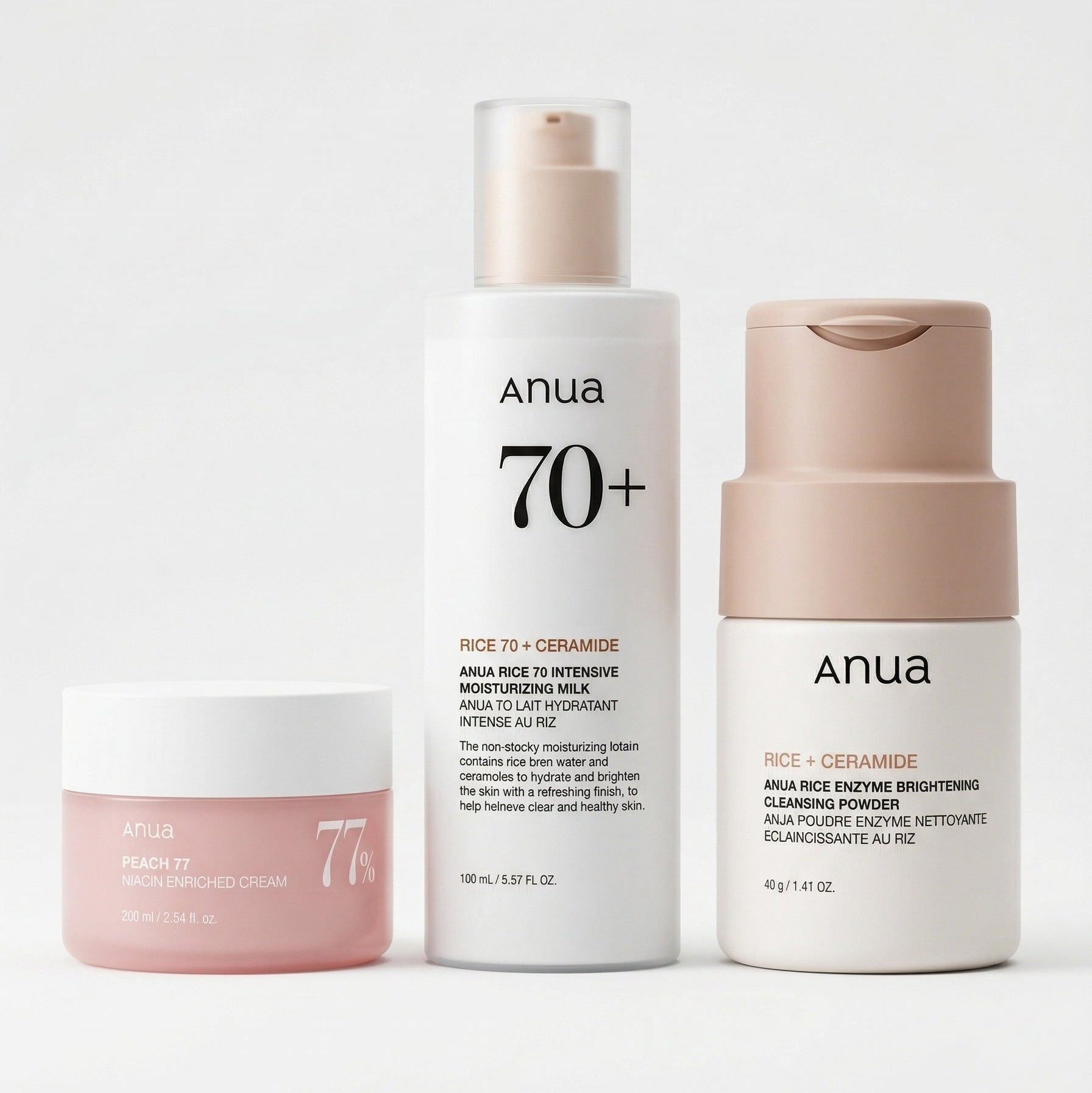 Commencez par nettoyer la peau avec le Rice 70+ Ceramide Intensive Moisture Cleanser. Utilisez la Rice Enzyme Brightening Cleansing Powder selon les instructions pour affiner et illuminer le teint. Terminez avec la Peach 77 Niacin Enriched Cream pour hydrater, nourrir et laisser la peau douce et confortable.